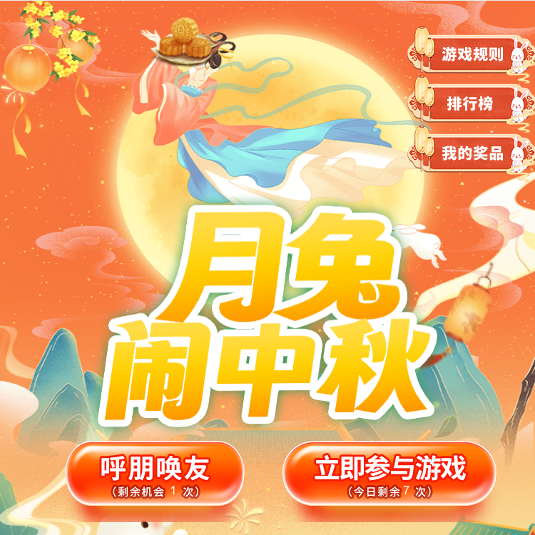月兔滑动木舟闹中秋,嫦娥撒落月饼、红包、桂花等,可以吃到不同分值